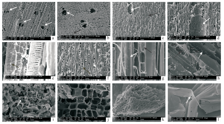 图 3 木薯茎秆的扫描电子显微照片 Figure 3 SEM micrographs of cassava stems a:横切面,白箭头示管孔;b:横切面,白箭头示侵填体,黑箭头示木射线;c:弦切面,白箭头示导管及侵填体,黑箭头示木射线细胞;d:径切面,白箭头示导管上互列单纹孔;e:弦切面,白箭头示导管上梯状纹孔,黑箭头示具缘纹孔;f:弦切面,黑箭头示单列木射线细胞;g:弦切面,白箭头示纤维细胞壁,黑箭头示单列木射线细胞;h:弦切面,白箭头示纤维细胞腔内淀粉粒,黑箭头示木射线细胞腔内淀粉粒;i:横切面,白箭头示细胞腔内淀粉粒;j:淀粉颗粒少的细胞横切面;k:髓心,蜂窝状;l:髓心,白箭头示髓心薄膜上孔. |