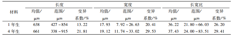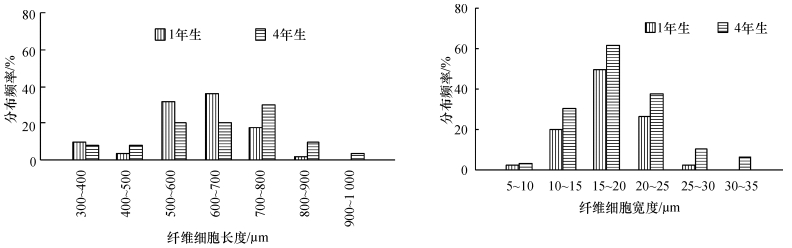 由图 5可知,1年生和4年生木薯茎秆的纤维细胞长度和宽度分布频率近似正态分布,长度主要分布在500 ~ 900 μm,宽度主要分布在10 ~ 25 μm,4年生的长度和宽度分布比率分别为90%和98%,略高于1年生的分布比率(88%和89%),长宽分布均较集中.