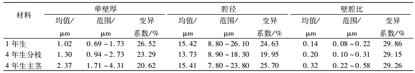 木纤维是两端尖削,呈长纺锤形的细胞(图 4).由表 1和表 2可知,1年生和4年生木薯茎秆纤维细胞的长度、宽度相差不大,但壁厚相差较大,其中主茎段是其分枝段的1.5倍多,分枝段为1年生的1倍多.可见,生长期对木薯茎秆纤维细胞的长度、宽度及其长宽比、腔径尺寸影响不明显,但对纤维细胞的壁厚及其壁腔比影响较明显.细胞壁及其壁腔比越大,茎秆材料的密度和强度越高[11].