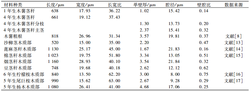 表 3 木薯茎秆与木薯粗根、农作物茎秆、速生材的纤维形态比较 Table 3 Fiber morphology comparisons of cassava stems and cassava roots, crop stalks and fast growing wood |