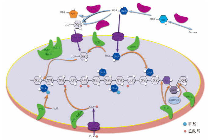 木聚糖的研究起步较早,但以前的研究主要集中于对不同植物测定木糖转移酶活性和木聚糖的成分分析上[11],而在分子水平上揭示木聚糖的合成机理则主要发生于最近这10年.其中,报道于2005年[12]的Fragile fiber 8 (FRA8)基因第1次从分子水平上揭示了木聚糖的生物合成.随着生物质能源的兴起,木聚糖的研究更是取得了突破性进展,成为植物细胞壁研究的一个热点.本文综述了近10年来葡萄糖醛酸木聚糖合成分子机理上的研究进展.