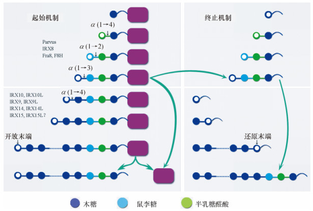 第1种机制认为,还原四糖结构在木聚糖的合成中起到起始物的功能,木糖不断添加到非还原末端使之延长.来源于动物的葡糖氨基葡聚糖的合成也是这种形式,葡糖氨基葡聚糖的还原末端有1个连接寡糖,它经由1个木糖的还原末端连接到蛋白质上,通过不断在非还原末端添加单糖,葡糖氨基葡聚糖得以延伸[66],然而在植物中,对这种机制的支持证据还比较缺乏.
