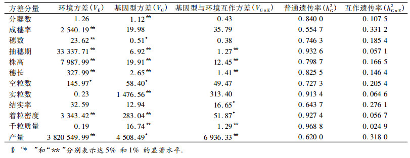 表 2 单个性状的方差和遗传率分量1) Table 2 The estimations of variance and heritability components for each of observed traits |