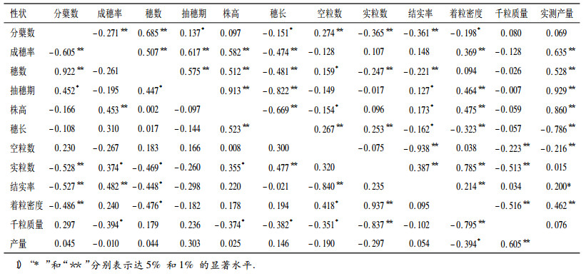 产量是重要的育种目标,是多种因素综合影响的结果,与许多性状包括株形和穗部性状等关系密切.本研究表明,产量与分蘖数、实粒数、千粒质量的表型相关不显著,但与其他性状间的相关则达显著或极显著水平,其中与穗长、空粒数呈负相关,其余为正相关; 表型决定系数在0~0.863之间变动.然而,与产量遗传相关显著的则仅有着粒密度和千粒质量2个性状,前者为负相关,决定系数为0.155,贡献率为15.5%;后者为正相关,决定系数0.366,贡献率为36.6%.