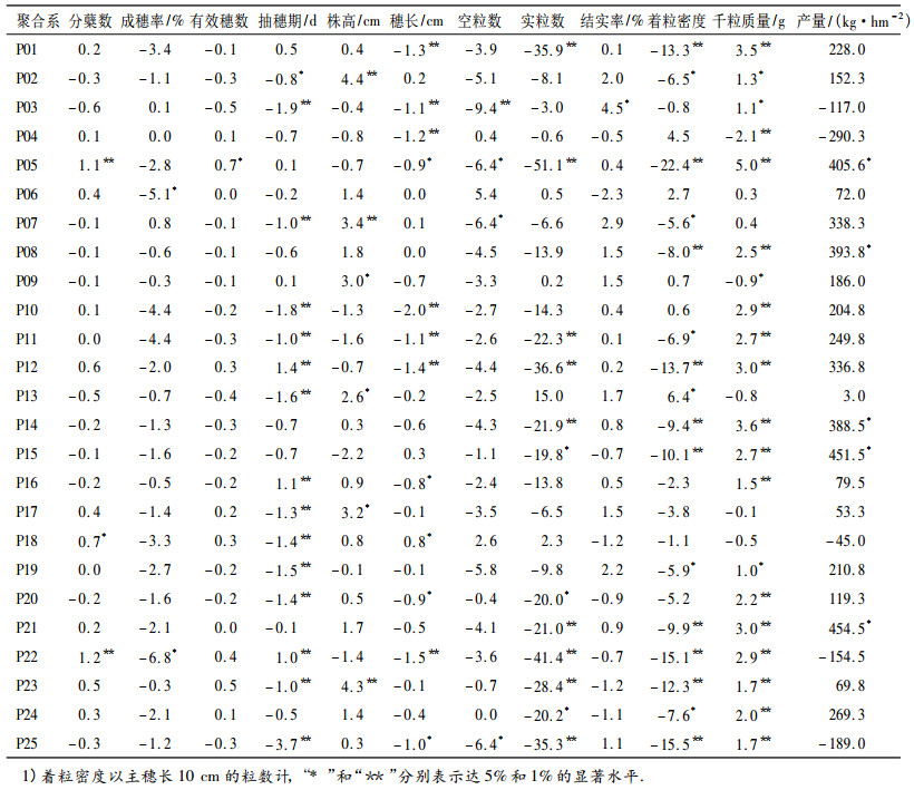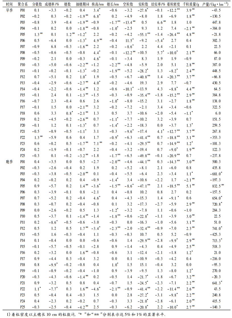 为评价早、晚两季各聚合系的表现,它们各季与对照的差值及其显著性列于表 5. 表 5的结果表明,早、晚季之间一些聚合系对某些性状表现出较大的差异,而对另一些性状则比较稳定.如P05除千粒质量外,其他性状的效应早、晚季间差异明显.早、晚季产量效应间的差异较大,早季没发现有显著改变产量的聚合系,晚季显著增产的聚合系有P05、P07、P08、P12、P14和P21.