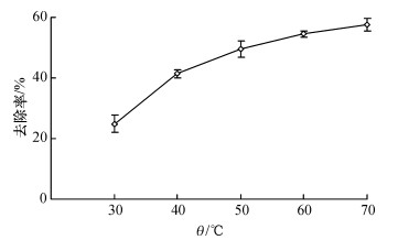 2 结果与分析 2.1 不同处理对去除沼液中VOCs的影响如图 1所示,随沼液加热温度的上升,对沼液中VOCs的去除率不断上升.当温度从30℃升温至50℃,VOCs去除率提高24.7%;温度从50℃升温至70℃,VOCs去除率提高8.2%,增幅较小.当温度达到70℃时,VOCs的去除率最高,但仅为57.7%,还不能满足沼液中VOCs的去除要求.