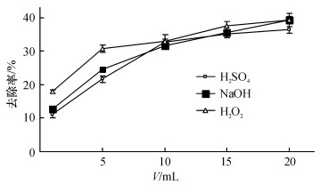 化学试剂处理:取沼液样品200 mL于500 mL三角瓶中,将硫酸、氢氧化钠和过氧化氢分别配制成0.1 mol·L-1的溶液,加入到沼液样品中,加入量设定为1、5、10、15、20 mL,将三角瓶加塞密封,在磁力搅拌器的搅拌下持续180 min后,取样测定沼液中的VOCs.