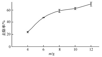 如图 3所示,随着活性炭用量的增加,沼液中VOCs去除率逐渐升高,当200 mL沼液活性炭用量达到12 g时,VOCs的去除率达69.9%,效果较好.