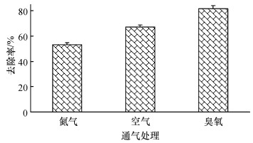 分别向沼液中通入氮气、空气和臭氧,并对沼液进行曝气处理,沼液中VOCs的去除结果见图 4.通臭氧、空气和氮气的VOCs去除率分别为81.7%、67.3%和53.0%.氮气仅具有吹脱作用,而空气和臭氧均具有氧化性,除了挥发作用,还能通过氧化挥发性有机物促使沼液中VOCs含量迅速降低.扣除吹脱作用的影响,通臭氧和空气处理的纯粹氧化作用对沼液中VOCs的去除率分别为28.7%和14.3%.通臭氧和空气处理明显优于通氮气处理,处理效果臭氧要优于空气.