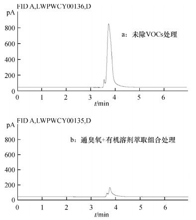 将前述去除沼液中VOCs效果较好的通臭氧处理和有机溶剂处理按顺序进行组合,VOCs的峰面积降至762(图 5),总去除率达到94.1%,明显高于2种单项处理技术.
