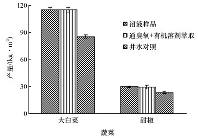 肥效验证采用田间小区试验.供试土壤为黑土,土壤主要理化性质:有机质37.51 g·kg-1、总氮3.17 g·kg-1、有效磷48.65 mg·kg-1、速效钾176.37 mg·kg-1、pH 6.14.供试蔬菜为大白菜(北京大牛心)和甜椒(中椒4号).小区面积为8.0 m2.设置3个处理:处理1施用沼液样品,处理2施用通臭氧+有机溶剂萃取处理的沼液,处理3施用井水(对照),各处理施用量均为4.37 L·m-2,进行常规田间管理.每个处理重复3次.
