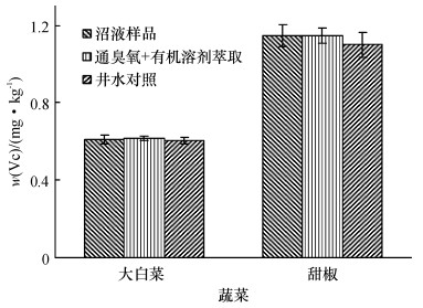 由图 7可以看出:施用沼液样品和通臭氧+有机溶剂萃取处理与井水对照相比,大白菜和甜椒2种蔬菜中维生素C的含量未见显著性差异.表明沼液去除VOCs后,对蔬菜品质没有影响.