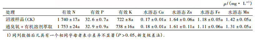 1.2.2 沼液中营养元素成分分析及肥效验证分别测定沼液样品和通臭氧+有机溶剂萃取处理后的沼液中的N、P、K、Cu、Zn、Fe、Mn等养分指标.