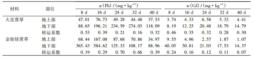 1.2 萱草对Pb、Cd的吸收特性在加入重金属后按0、8、16、24、32、40 d的时间间隔收获植株,沿土面剪取植株地上部,将地上部和根系分别用自来水和去离子水冲洗干净,沥去水分后,先在105℃下杀青30 min,然后于70℃烘至恒质量,磨碎并充分混匀. Pb、Cd含量采用浓HNO3- HClO4(体积比为5: 1)法消化、用石墨炉原子吸收分光光度计测定.