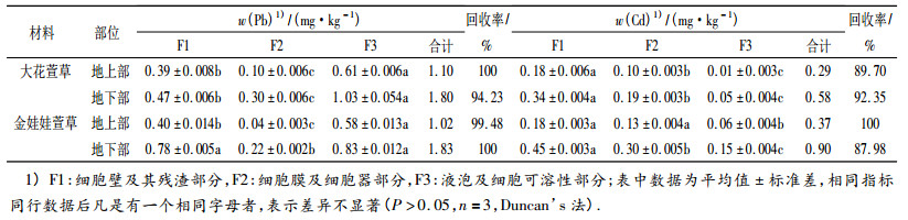 2种萱草地上部和地下部总Pb含量:大花萱草 > 金娃娃萱草; 总Cd含量:金娃娃萱草 > 大花萱草. 2种萱草地上部、地下部亚细胞组分Pb和Cd含量回收率均大于87%.