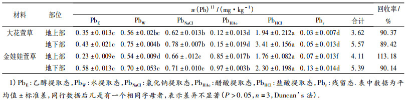 表 3 2种萱草地上、地下部分各化学形态铅含量 Table 3 The Pb contents of different chemical forms in above and below ground parts of two types of Hemerocallis plants |