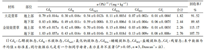 2.3 萱草中Pb、Cd的化学形态分析从表 3可知,大花萱草地上、地下部各种化学形态Pb含量大小为PbHCl > PbNaCl > PbW > PbE > PbHAc > Pbr; 金娃娃萱草地上、地下部Pb含量大小为PbHCl > PbHAc > PbNaCl > PbW > PbE > Pbr.由表 4可看出,大花萱草和金娃娃萱草地上、地下部各种化学形态Cd含量大小均为CdE > CdNaCl > CdW > CdHAc > CdHCl > Cdr; 2种萱草地上、地下部分各种化学形态Pb、Cd含量的回收率均大于87%.
