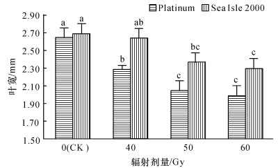 图 1 不同辐射剂量对海滨雀稗叶宽的影响 Figure 1 Effects of different irradiation doses on leaf width of seashore paspalum 同类柱子上凡是有一个相同小写字母者,表示不同剂量之间差异不显著(P > 0.05,LSD法). |
