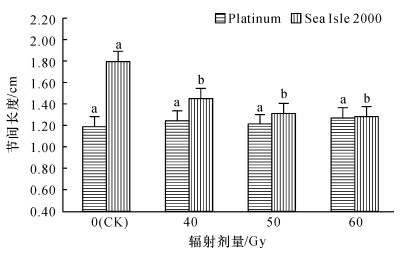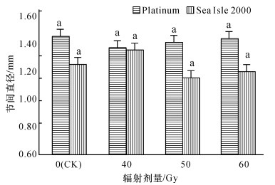 从图 3可以看出,不同辐射剂量下的Platinum和Sea Isle 2000匍匐茎节间直径均差异不显著(P > 0.05).与对照相比,60 Coγ射线辐射处理对Platinum和Sea Isle 2000匍匐茎节间直径没有显著影响.