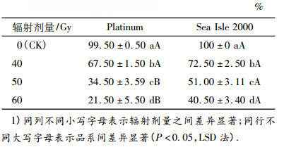 2 结果与分析 2.1 60Coγ射线辐射处理对海滨雀稗匍匐茎成活率的影响由表 1可知,不同剂量的60 Coγ射线辐射对海滨雀稗扦插匍匐茎成活率有显著影响,且辐射剂量越大,其影响程度越强.同一品种,随着辐射剂量的增加,海滨雀稗匍匐茎的成活率显著减小(P < 0.05).在低剂量处理下,Sea Isle 2000和Platinum品种间成活率差异不显著(P > 0.05);辐射剂量在50和60 Gy条件下,Sea Isle 2000的成活率显著高于Platinum (P < 0.05).