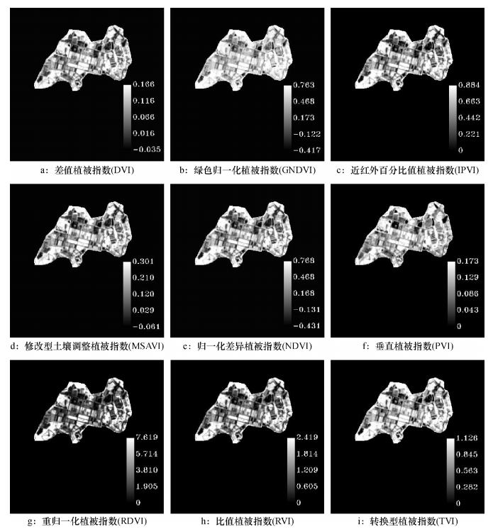 图 2 基于“高分一号”影像提取的9种植被指数 Figure 2 Nine types of vegetation indices extracted with GF-1 |