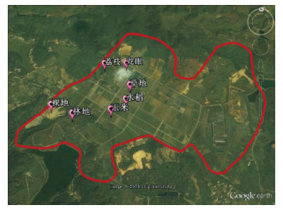 图 4 Google earth显示的研究区(红线范围内)概况 Figure 4 The study area displayed on Google earth (the red line included) |