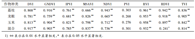 在建立回归模型之前,先对9种不同植被指数与荔枝、龙眼和玉米以及它们混合的SPAD进行相关性分析(表 1).从表 1中可以看到,对于荔枝、龙眼和玉米品种,除植被指数PVI外,其余8种植被指数均与它们冠层SPAD显著相关.而对于它们SPAD混合数据统计中发现,植被指数RDVI与混合SPAD在检验水准0.01水平上不具有显著相关性.可见,尽管植被指数RDVI与荔枝、龙眼和玉米SPAD之间的相关性极其显著,但植被指数RDVI对作物种类比较敏感,混合后的SPAD不再与其具有极其显著相关,同时相关系数偏低,不适宜利用植被指数RDVI反演大面积亚热带典型作物冠层SPAD.故利用DVI、GNDVI等7种植被指数建立亚热带典型作物冠层SPAD的回归模型是可行的.