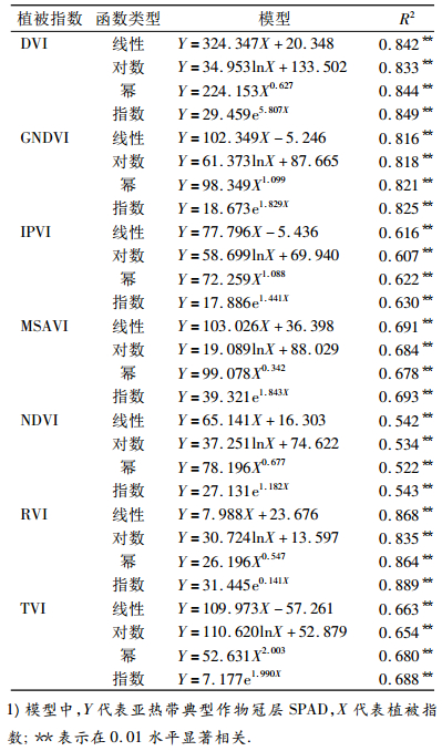 表 1 不同植被指数与亚热带典型作物SPAD的相关系数1) Table 1 The correlation coefficient between the different vegetation indices and typical subtropical crops SPAD |