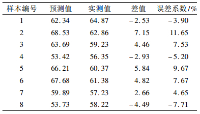为验证植被指数RVI中指数回归模型Y = 31.445e0.141X反演亚热带典型作物冠层SPAD的精度,根据误差系数公式(10),采用未参与建模的8组荔枝冠层叶片SPAD对反演模型进行精度验证.检验结果(表 3)表明,对于指数回归模型Y = 31.445e0.141X反演的亚热带典型作物冠层叶片SPAD与实测值较为接近,预测值与实测值的误差范围为-7.71%~11.65%.平均误差7.25%,拟合精度达92.75%.采用均方根误差(RSME)法对预测值和实测值的符合程度进行检验,RMSE为4.58.结果表明利用植被指数RVI的指数回归模型估测亚热带典型作物冠层SPAD是可行的.