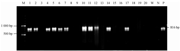 图 2 利用引物S1-F/S1-R PCR验证部分转化植株 Figure 2 PCR verification of some transgenic plants by primer S1-F/S1-R M:100 bp DNA分子质量标记; 1~20:转化植株总DNA为模板PCR产物; W:以水为模板PCR产物; N:以非转基因材料的超高油玉米总DNA为模板PCR产物; P:以pBI121D质粒DNA为模板PCR产物. |