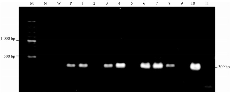 图 3 利用引物S2-F/S2-R PCR验证部分转化植株 Figure 3 PCR verification of some transgenic plants by primer S2-F/S2-R M:100 bp DNA分子质量标记; 1~11:转化植株总DNA为模板PCR产物; W:以水为模板PCR产物; N:以非转基因材料的超高油玉米总DNA为模板PCR产物; P:以pBI121D质粒DNA为模板PCR产物. |