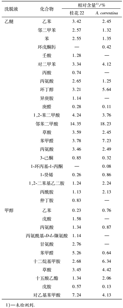 2 结果与分析 2.1 花生根系分泌物GC-MS测定结果花生根分泌物GC-MS测定结果见表 1.由表 1可看出:花生根分泌物分离鉴定出24种主要成分, 包括有机酸类、醇类、酯类、酮类、醛类、苯类、烃类、胺类、酰胺类等有机化合物, 另外还有一些烷烃类化合物和苯酚未列出.其中的水溶性有机酸、苯甲酸的衍生物、醇、酮、苯等低分子有机化合物是常见报道的根系分泌物[7].乙醚组分分离出的物质较多, 从A. correntina和桂花22根系分泌物中共分离出22种有机化合物, 2个花生品种共有的根系分泌物质有16种, 不同的组分有6种, 其中在A. correntina根系分泌物质中分离出环戊酮肟和1-环丙基-1-丙酮, 在桂花22根系分泌物质中分离出壬酸、丙酸、异庚胺、仲丁胺.甲醇有11种, 2个花生品种共有的根系分泌物质有8种, 不同的组分有3种, 分别为:戊酸、丙氨酰基-D-L-缬氨酸和甘氨酸, 这3种物质均于桂花22根系分泌物质中分离得出. 2个花生品种的根系分泌物含量较大的主要有:邻苯二甲酸、苯甲醛、草酸、对乙基苯甲酸、丙酰胺、丙氨酸、戊酸等.