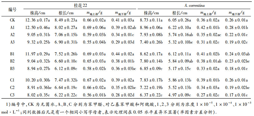 花生根分泌物对花生幼苗生物检测结果(表 2)表明, A. correntina和桂花22的根分泌物各组分对幼苗的生长均影响不大, 与对照相比未表现出显著抑制作用, 可能与分离出的物质浓度过低有关.考虑到苯甲醛及对乙基苯甲酸在2个花生品种根分泌物测定中的含量较高, 而且许多苯甲酸的衍生物被报道具有化感作用[8-9], 因此选取这2种物质进行生物检测, 另以最常见的化感物质阿魏酸作为比较.从表 2可以看出, 苯甲醛、对乙基苯甲酸、阿魏酸的低浓度处理(1 × 10-5 mol·L-1)对2个花生品种的株高、根长、地上部干质量和地下部干质量有促进作用或弱的抑制作用, 而其他2个浓度处理(1 × 10-3和1 × 10-4 mol·L-1)都存在不同程度的抑制作用.苯甲醛、对乙基苯甲酸、阿魏酸高浓度处理(1 × 10-3 mol·L-1)2个花生品种的株高、根长、地上部干质量和地下部干质量与对照相比差异均达到显著水平(P < 0.05).