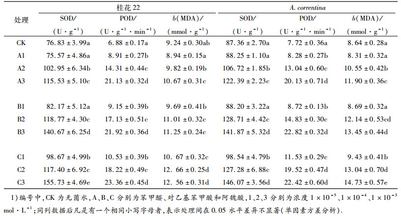 由表 3可以看出, 苯甲醛、对乙基苯甲酸、阿魏酸处理的桂花22和A. correntina幼苗叶片的SOD酶活性、POD酶活性和MDA含量与对照相比均有不同程度的增加, 说明花生幼苗受到了胁迫, 从而引发了抗氧化反应.与对照相比, 低浓度的苯甲醛处理(1 × 10-5mol·L-1)对A. correntina叶片的SOD酶活性、POD酶活性和MDA含量以及桂花22叶片的SOD酶活性和MDA含量增加幅度较小, 而1 × 10-4和1 × 10-3mol·L-1乙基苯甲酸、阿魏酸处理的2个花生品种叶片SOD酶活性、POD酶活性和MDA含量均表现出不同程度的上升趋势, 且高浓度处理(1 × 10-3 mol·L-1)与对照差异均达显著水平(P < 0.05).