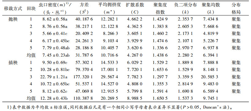 Waters(1959)认为k值与虫口密度无关,k值越小,种群的聚集度越大,k值趋于+∞时(>8),则接近Poisson分布。表 1中,抛秧与插秧2种移栽方式下的k值为1.393 6~3.359 5,因此,抛秧与插秧田稻水象甲幼虫的分布型均不符合Poisson分布,且前者的聚集强度比后者小。