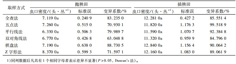 2.2 2种移栽方式下幼虫的抽样调查技术 2.2.1 抽样方法比较将调查结果绘制成坐标图,分别采用五点法、平行线式、双对角线式、棋盘法和Z字形取样法抽取同样的样本数比较各方法的平均数标准误及变异系数,结果见表 2。对5种调查方法测定结果用邓肯氏新复极差法进行差异显著性分析,结果表明五点法、平行线式、双对角线式、棋盘法和Z字形取样法下, 抛秧和插秧2种移栽方式下稻水象甲幼虫的田间调查虫口密度差异不显著,接近田间实际情况(全查法),田间调查时可采用其中任何一种调查方法。在田间稻水象甲幼虫系统调查中,无论是抛秧田还是插秧田,变异系数均以双对角线法最小,分别为63.048 8%和84.796 0%,综合考虑田间调查的操作性以及5种抽样方法中的平均数标准误和变异系数,均以双对角线取样法为最佳取样方式。