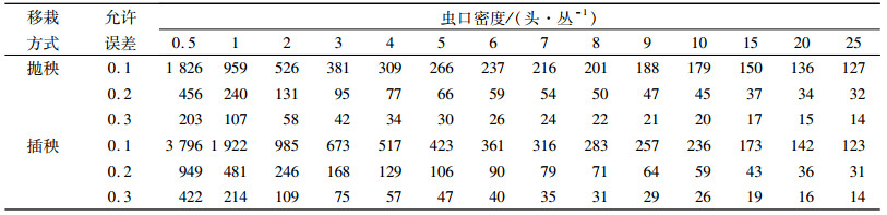 由于Iwao回归模型中的平均拥挤度m*与平均虫口密度m之间的线性关系显著,将系数α、β代入模型,得稻水象甲幼虫在抛秧田中的最适理论抽样公式为:N=t2(2.256/m+0.240)/D2;插秧田为:N=t2(4.878/m+0.126)/D2。取置信度为95%时的t分布值1.96,假设允许误差D分别为0.1、0.2、0.3,田间理论抽样数随稻水象甲幼虫密度的不同而改变(表 3)。允许误差值一定的情况下,所需抽样数随幼虫平均密度增大而减少。