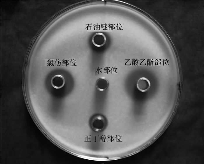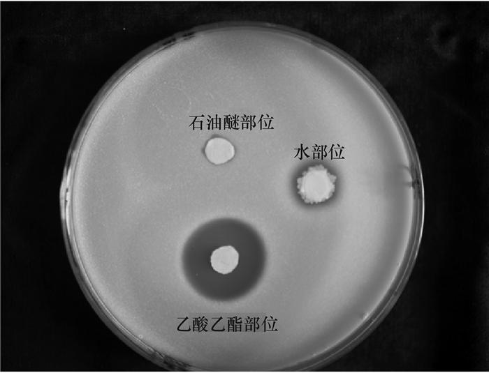 2 结果 2.1 活性部位初探的结果1 L的生防菌HN011发酵液通过冷冻离心去除菌体,分别用等比例不同极性的有机溶剂萃取3次,通过旋转蒸发回收有机溶剂得石油醚部位浸膏0.41 g、氯仿部位浸膏0.22 g、乙酸乙酯部位浸膏0.42 g、正丁醇部位浸膏1.10 g。各部位的金黄色葡萄球菌抑制试验结果表明,乙酸乙酯部位的抑菌圈最大,其次是氯仿部位、石油醚部位、正丁醇部位,水部位基本没有活性(图 1)。考虑到乙酸乙酯部位和氯仿部位都具有活性,并且氯仿和乙酸乙酯的化学极性相差不大,放大发酵后,去除菌体的发酵液经过石油醚萃取后,直接使用乙酸乙酯进行萃取,余下水部位,3个组分的金黄色葡萄球菌抑制试验结果(图 2)表明,石油醚部位和水部位抑菌圈较小,而乙酸乙酯部位抑菌圈较大,和预期的结果一致,生防菌HN011的活性次级代谢产物都可以被乙酸乙酯萃取出来。