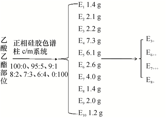 利用正相硅胶色谱分离技术将30.6 g乙酸乙酯部位浸膏进行分段。30 g正相硅胶拌样后,采用φ为100%氯仿湿法装柱干法上样的方法,氯仿-甲醇系统进行梯度洗脱,根据柱体积2 000 mL,以500 mL为1个小馏分,每个梯度洗脱3~4个柱体积。TLC色谱方法分析各个小馏分后,根据主点合并得10个馏分段。利用牛津杯法,对各馏分进行金黄色葡萄球菌抑制活性试验,结果(图 3)表明,馏分E7的活性最明显,馏分E6次之,E3和E8较弱,其他的馏分活性不明显。