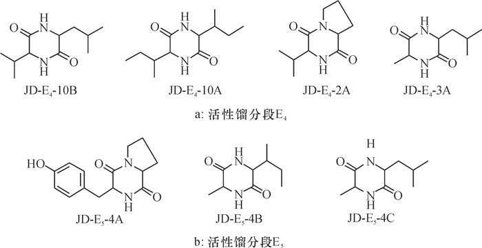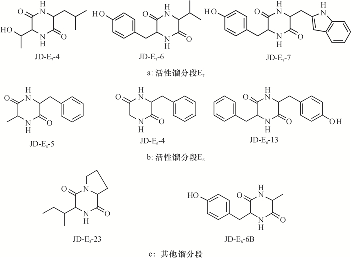 将活性馏分段E6(2.6 g)通过ODS反相中压色谱进行分离,得到14个小组分,其中小组分4、5、13有明显的主点,通过HPLC分析,发现E6的13个小组分和E7-8出峰时间一致,利用薄层色谱技术进行比对,Rf一致,证明E6-13就是Cyclic(Phe-Tyr)。小组分4、5通过制备液相得到化合物E6-4和E6-5,利用核磁共振氢谱和核磁共振碳谱进行结构解析,并用质谱进行验证,参考和比对文献,鉴定化合物E6-4为Cyclic(Phe-Gly),E6-5为Cyclic(Phe-Ala)(图 4b)。
