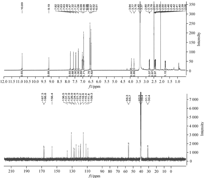 图 6 E7-7核磁共振氢谱和碳谱图 Figure 6 The spectra of proton NMR and carbon NMR of E7-7 |