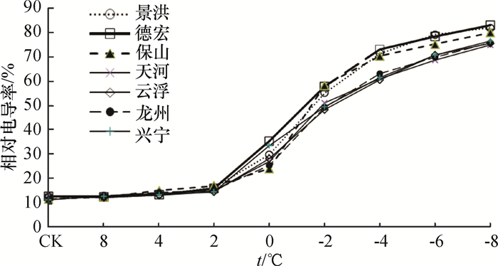2 结果与分析 2.1 不同种源枝芽在低温胁迫下相对电导率的变化及细胞膜受伤温度的确定从图 1可以看出,各种源在胁迫处理8~-8 ℃间,相对电导率的变化曲线基本呈“S”型,并且均在0~-4 ℃间变化较大。兴宁、云浮和天河种源在0~-4 ℃间的增加幅度略小,分别为28.16%、32.57%和34.06%,而保山和景宏种源的增加幅度较高,分别为46.43%和41.70%。在CK以及8~2 ℃低温间的变化曲线均近似于水平线,不同种源在相同低温处理下、同一种源在不同低温胁迫处理下的相对电导率变化较小;在胁迫温度小于-6 ℃后,各种源相对电导率变化减缓,并逐渐接近各自的最大值,表明细胞膜已接近完全受破坏。