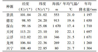 1 材料与方法 1.1 试验材料从1.5年生实生苗植株剪取长度约为20 cm的带芽枝条作为试验材料,景洪、德宏、保山为云南种源,天河、云浮为广东种源,龙州、兴宁为广西种源。各种源来源情况详见表 1。种子均采集于10年以上树龄大树;种子播种后,苗高约20 cm时移植到施有20 kg农家肥的种植穴内,按需浇水,1年后开始在根部追施复合肥。种植地位于广东省增城市华南农业大学科研基地,地理位置E 113°37′,N 23°14′,海拔20.3 m,平均气温21.8 ℃,年均降水量2 137 mm;土质为黏壤土,地势平坦。