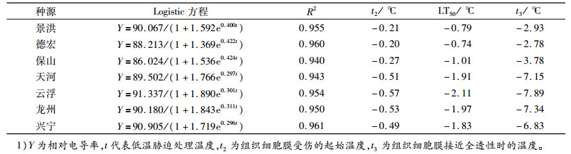 表 2 7个不同种源拟合的Logistic方程和细胞膜受伤温度1) Table 2 The logistic equation and cell membrane injury temperature of seven provenances after treated with low temperature |