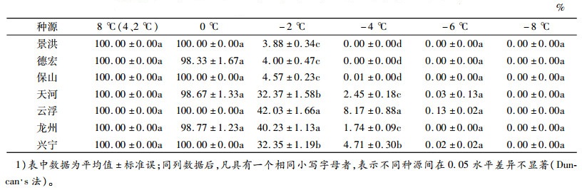 2.2 低温胁迫对不同种源恢复生长的影响不同低温胁迫处理下,黄梁木枝芽的存活率差异见表 3。当胁迫温度从0 ℃降至-2 ℃,7个种源存活率均下降明显:云南3个种源枝芽的存活率从几乎不受寒害迅速降低到4.0%左右(均值为4.15%),而广东和广西4个种源的枝芽存活率均从几乎不受寒害降低至30%~40%(均值分别为37.20%和36.38%)。在-2 ℃低温胁迫下,种源间存活率差异显著,景洪最低,为3.88%,云浮最高,为42.03%,广东和广西种源存活率均值分别是云南种源均值的8.96和8.76倍。当处理温度为-4 ℃时,云南3个种源几乎全部死亡,广东和广西4个种源仍有少量枝芽存活,云浮种源存活率最高,为8.17%;当处理温度为-6 ℃时,云南3个种源、龙州种源全部死亡,天河、兴宁和云浮种源均接近全部死亡,存活率分别为0.03%、0.02%和0.13%。这与用相对电导率拟合Logistic方程得出不同种源的半致死温度(LT50)在-0.74~-2.11 ℃基本一致。