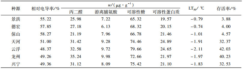 表 4 7个种源在-2 ℃低温胁迫下的理化指标 Table 4 Physicochemical indicators of seven provenances under low temperature (-2 ℃) stress |