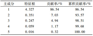 2.3.2 抗寒指标权重确定由于用单一生理和生化指标对抗寒性评价具有一定的片面性,而且不同生理生化指标之间的关系复杂,对抗寒性的重要性不同,因此,对选取的5个抗寒生理生化指标进行主成分分析。结果(表 5)表明,第1个主成分的特征根大于1,贡献率达86.54%,其他主成分的特征根均小于1,贡献率较小。故用第1个主成分就能够代表原5个生理生化指标变量的信息(即此主成分指标包含原5个抗寒指标86.54%的相关信息)。因此,以第1主成分分析各指标的负荷量,计算各指标对黄梁木抗寒性作用大小,确定权重Wi(表 6)。