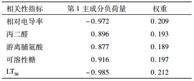 表 6 抗寒性指标的负荷量和权重 Table 6 Capacities and weights of cold resistance indicators |