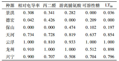 表 7 7个不同种源抗寒性指标的隶属度值 Table 7 Subordination values of cold resistance indicators of seven provenances |