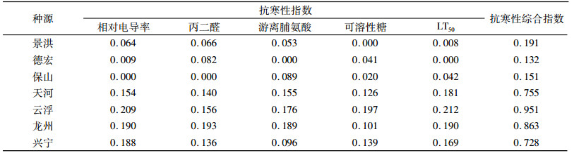 根据上述各指标的隶属度值和权重,通过式(6)计算抗寒性综合指数I(表 8),综合指数越大,表示抗寒性越强。由表 8可知,不同种源抗寒性从强到弱依次为云浮、龙州、天河、兴宁、景洪、保山、德宏。
